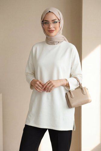 Eteği Kalp Detaylı Yırtmaçlı Salaş Penye Tunik Ekru