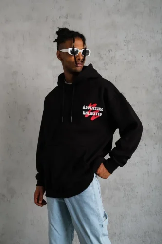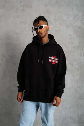 • Erkek Şapkalı Güvercin Baskılı Kapşonlu Sweat Siyah