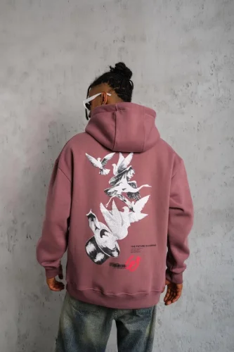 Erkek Şapkalı Güvercin Baskılı Kapşonlu Sweat Gül Kurusu