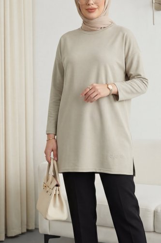 • Eteği Kalp Detaylı Yırtmaçlı Salaş Penye Tunik Taş