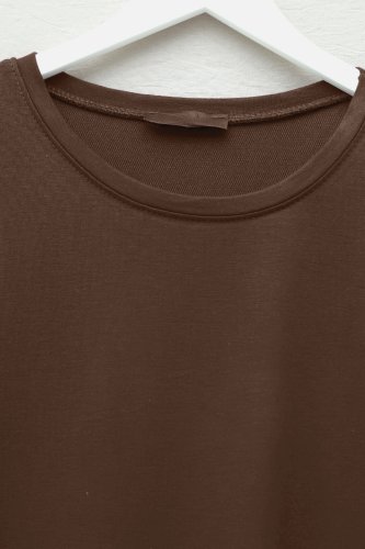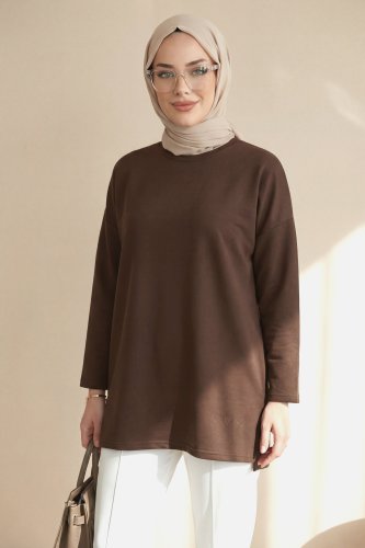 Eteği Kalp Detaylı Yırtmaçlı Salaş Penye Tunik Kahve