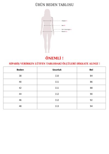 • Modelin Ölçüleri: Boy:165, Kilo:55, Göğüs:90, Bel:72, Kalça: 100
